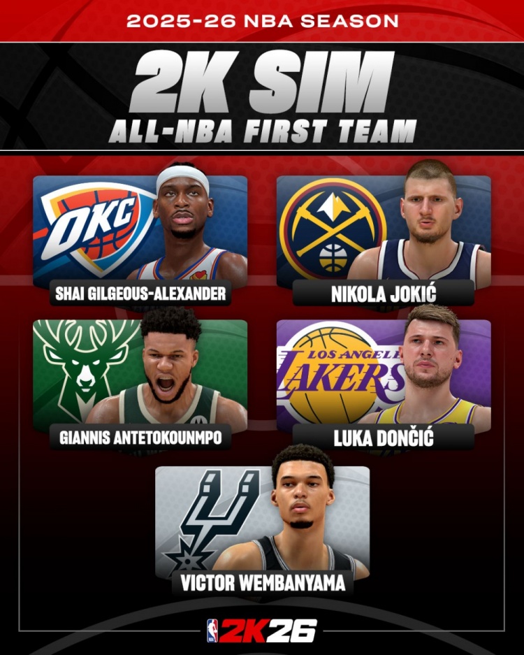 10月18日讯 NBA 2K26官方社媒更新动态,晒出了他们模拟预测的新赛季最佳阵容一阵、二阵还有三阵的球员,并配文写道:“NBA 2K模拟预测出的2025-26赛季最佳阵容出炉,你同意这份‘游戏版’评选吗?”