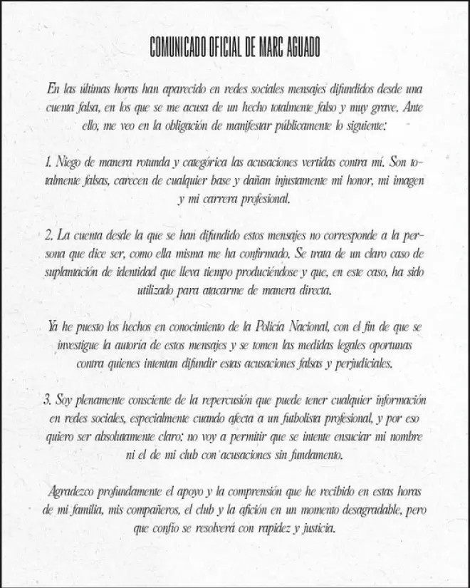 10月4日讯 埃尔切球员马克-阿瓜多近日发布官方声明,坚决否认了社交媒体上流传的关于他骚扰和威胁一名女性的指控。