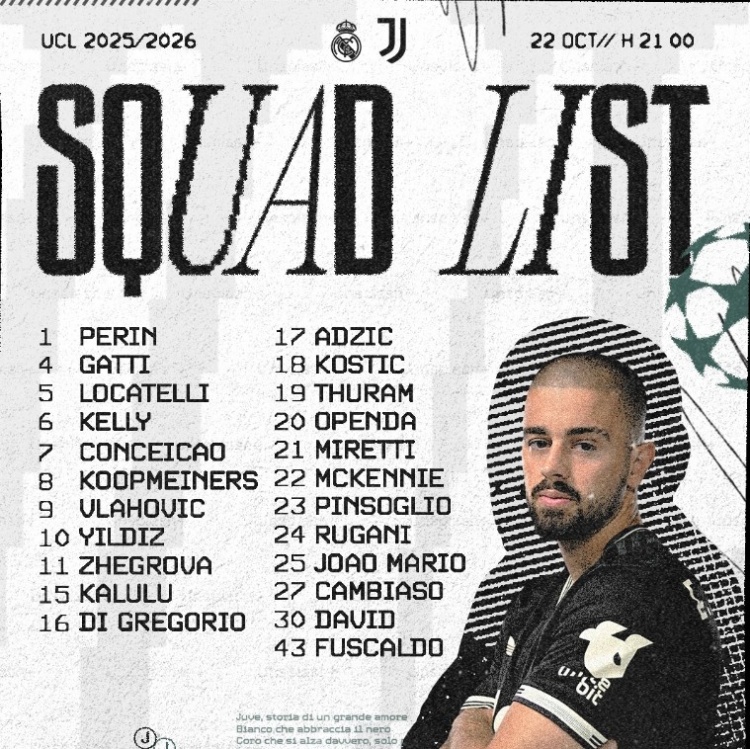 2025-10-22 00:05:58尤文客战皇马名单:伊尔迪兹在列,米雷蒂、热格罗瓦回归