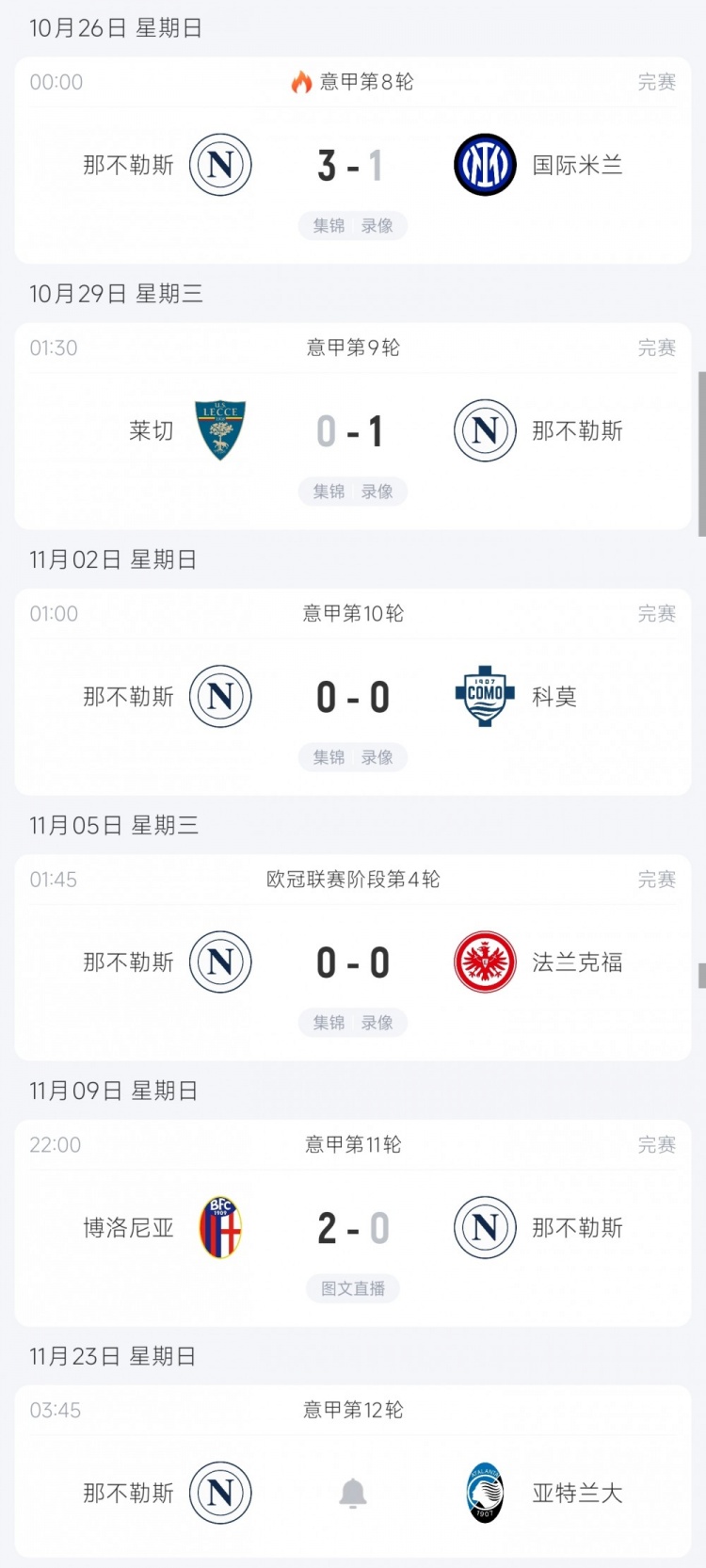 那不勒斯近期战绩↓
