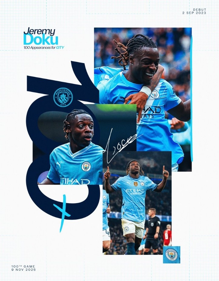 多库迎曼城生涯百场里程碑,已经为球队贡献16球24助攻